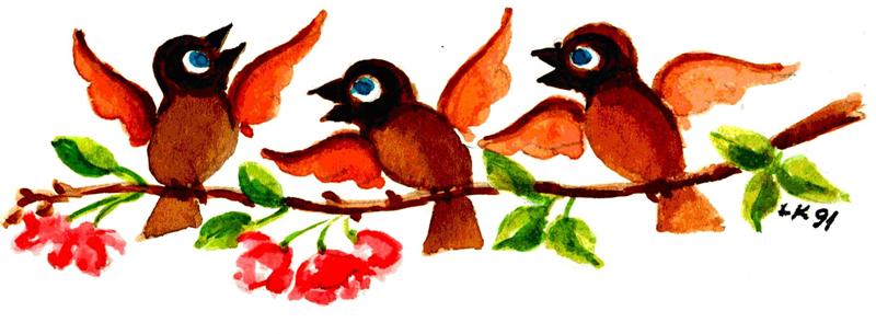 | VRABCE Típ típ típ vrabec vrabca štíp. Pobili sa na tom kríčku vytrhli si po pieročku. Típ típ típ vrabec vrabca štíp! (prstová hra) ![]() HOSTINA En ten tulipán na moste je starý pán a pod mostom ryba s chvostom kto ju chytí, bude hosťom. |